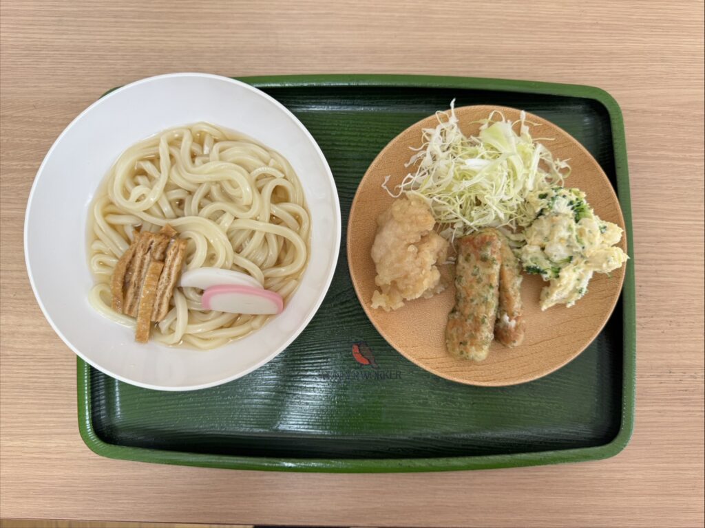 きつねうどん・磯辺揚げ・竜田揚げ・ポテトサラダ・千切りキャベツ