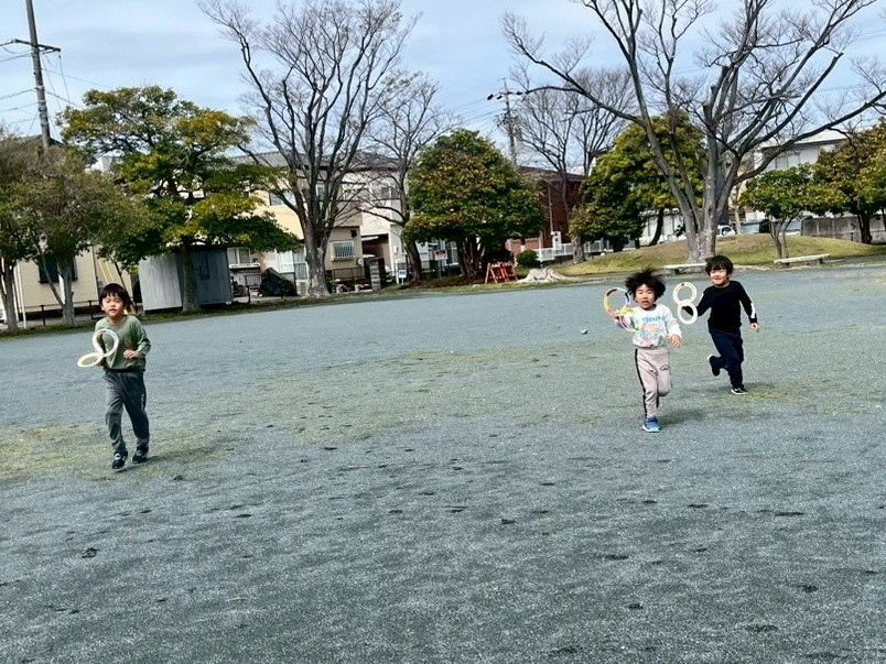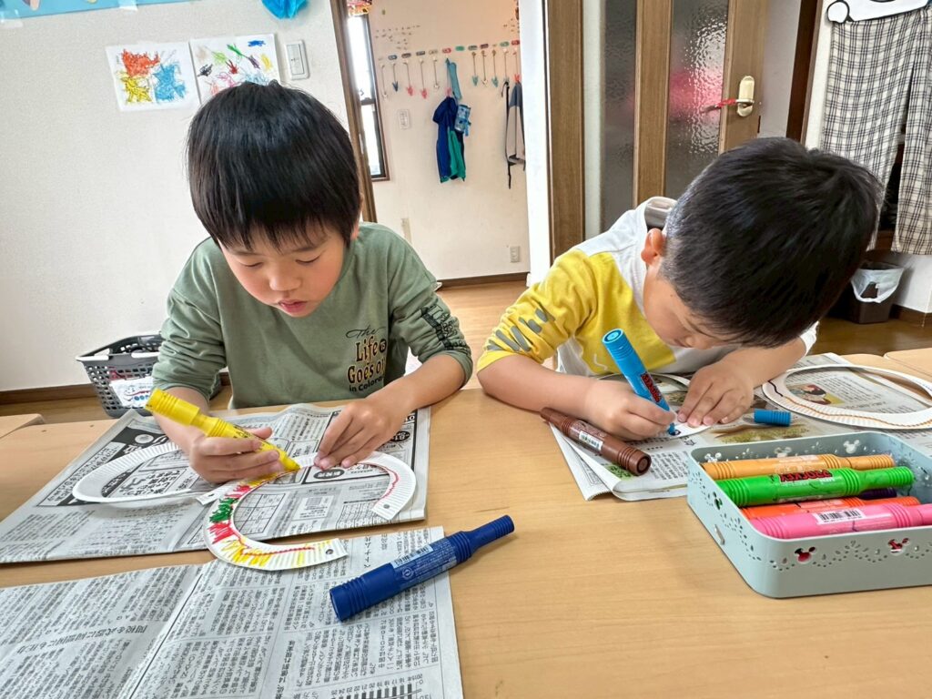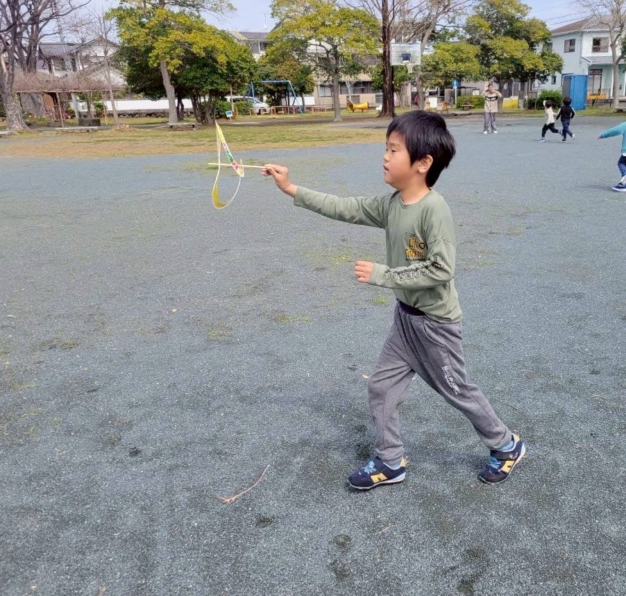 紙皿の縁を使ってかざぐるまを作ったよ!カラフルに色を塗られた2つの紙皿の縁を8の字状にして、棒に通したらできあがり!!さっそく公園に行って遊んだよ❣みんなが公園を走り回ると、かざぐるまもクルクルクルって回ったね☺あまりに楽しくて、汗をかくほど走ったよ(^▽^)/ 持ち帰ったかざぐるまで今度はお家の人と楽しんでね♬