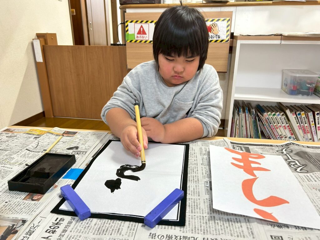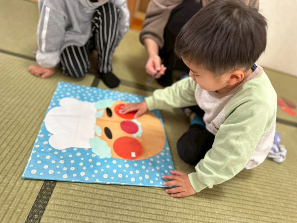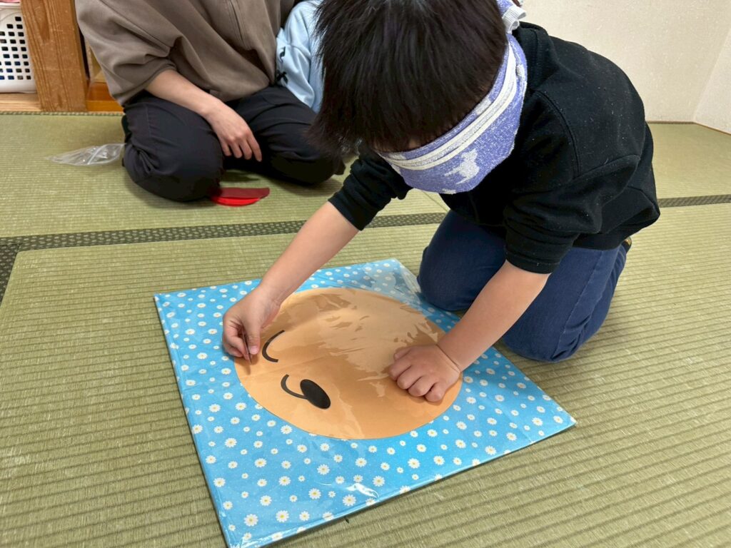 かもめ組:書初め・福笑い、廃材遊び、コーナー遊び(廃材・ブロック遊び)