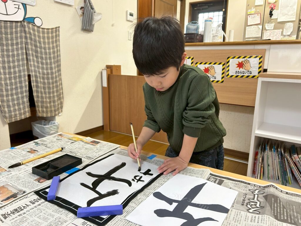 書初めで今年の干支“うま”を書いたよ。ひらがなだけでなく感じにも挑戦した子もいたね☺筆で文字を書くって難しいけど集中して書けたね💮福笑いは目隠しをして挑戦!周りのお友だちが教えてくれたけどオモシロい顔になったね。みんなの笑顔がいっぱいで楽しかったね!