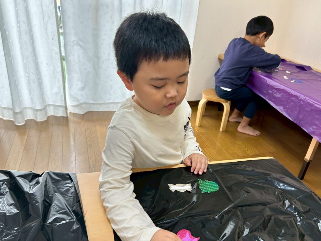 ハロウィンに向けて衣装作りをしたよ!ネコやかぼちゃ、キャンディーのシールを自分で選んで衣装にペタペタ・・・