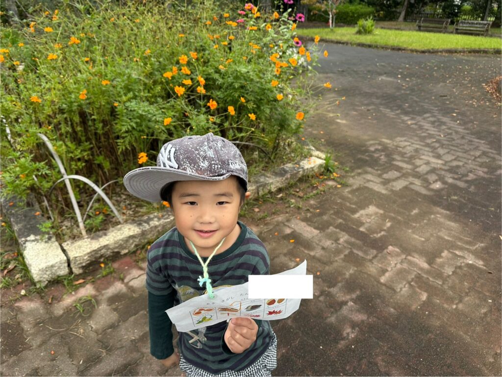 秋探し探検隊!今日はバージョンアップして8個の秋を探しに行ったよ!くもりだったから、カモととんぼは見つけられなかったけど、新しくほうずきやもみじ、金木犀を見つけることができたね(^^♪