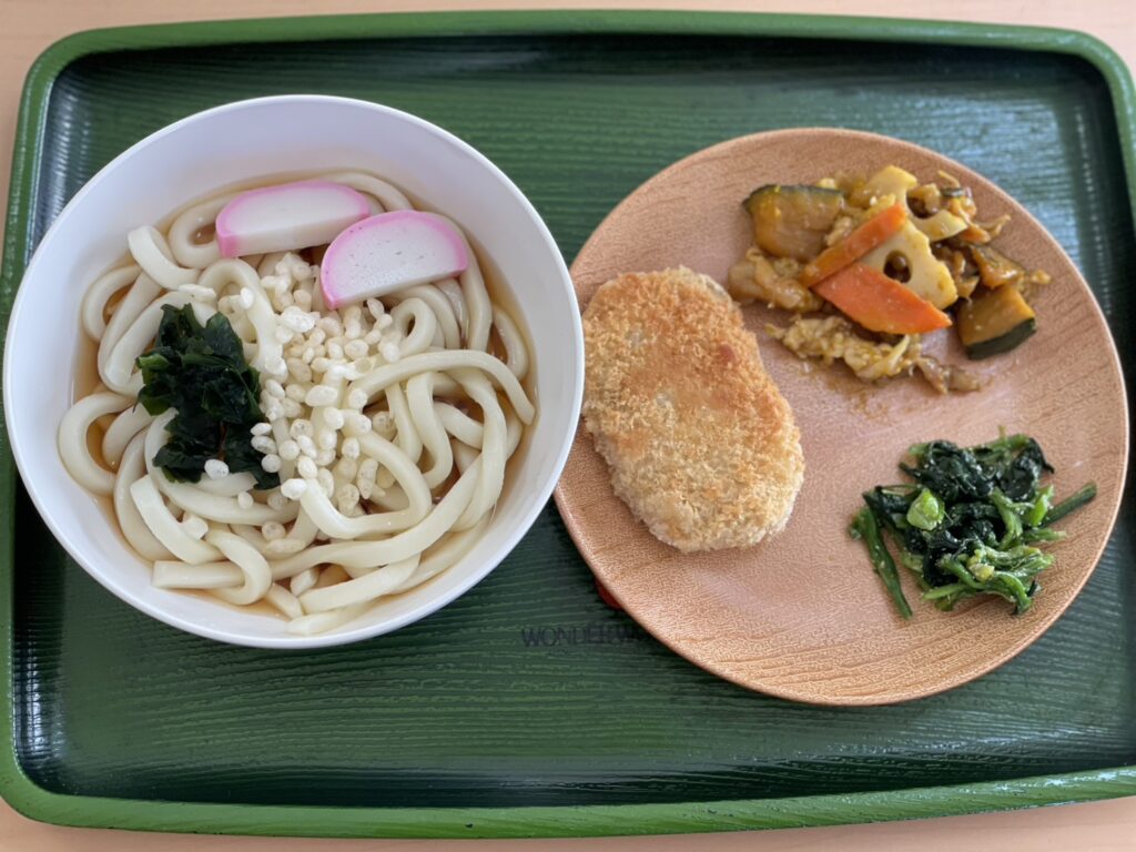 かけうどん、コロッケ、根菜と豚肉の甘辛炒め、ほうれん草のごま和え、MIXスナック/チョコレート