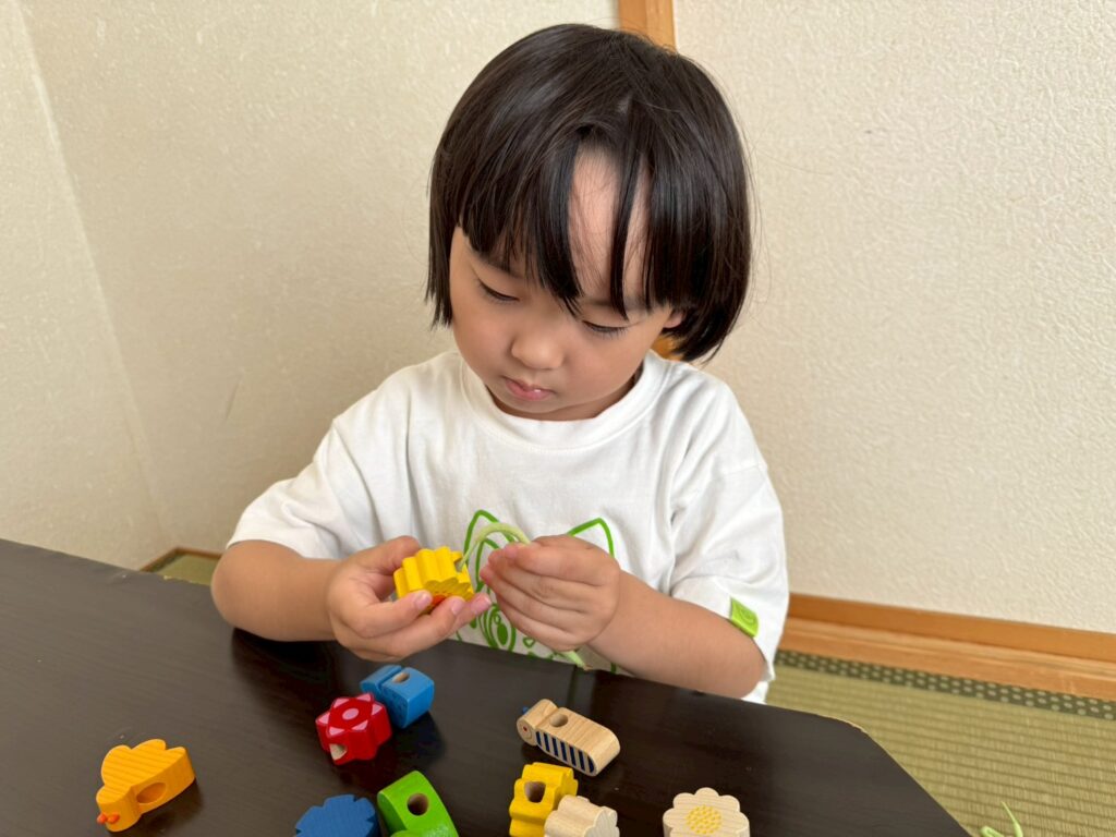 個別学習に取り組んだよ。「ピンク色の線が入っている乗り物はどれかな?」「せんせい、あったよ‼」色や形をよく見てカードを取ることが出来たね。紐通しやボタンはめでは、手元を見つめ、真剣な顔で最後まで頑張れたね(⌒∇⌒)