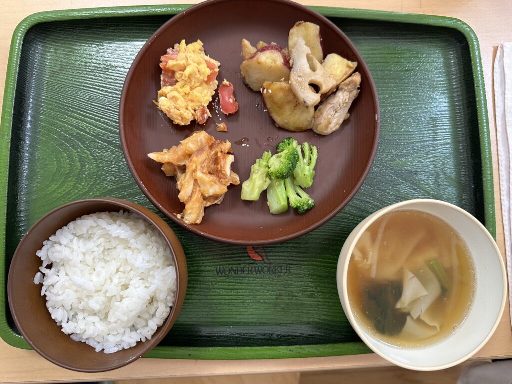 ご飯・野菜たっぷりワンタンスープ・ちくわのチリソース風・さつまいもと蓮根と鶏肉の中華炒め・ブロッコリー中華和え・トマトと卵のソテー