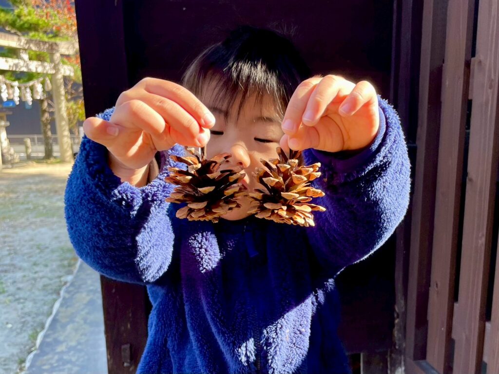 散歩では、秋を探しに津島神社に出かけたよ♪松ぼっくりがたくさん落ちていて、みんな両手いっぱいに拾っていたね🍂