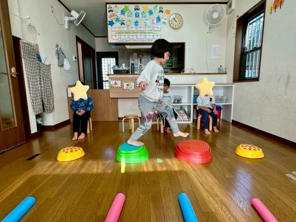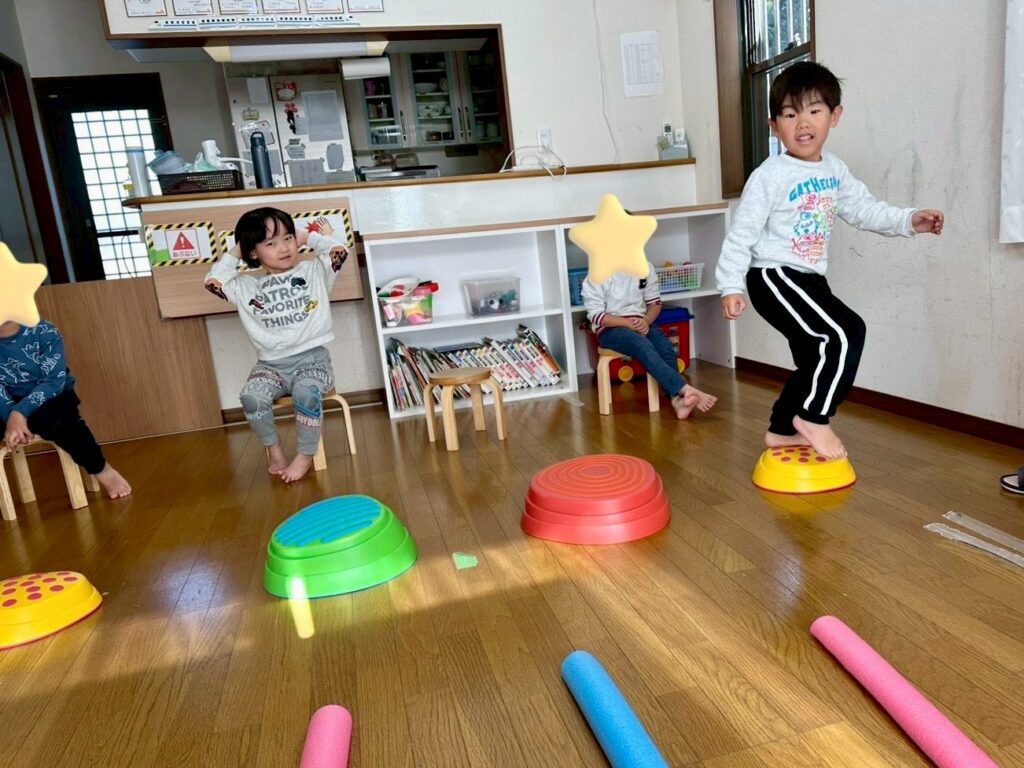 つばめ組さんは、リビングと和室を使ってたくさん体を動かしたよ。飛び石に両足ジャンプにジグザグ歩き!!初めて挑戦した子たちもいたけど、お手本を見て頑張れました✨ごほうびは風船遊び!!とっても楽しかったね♪