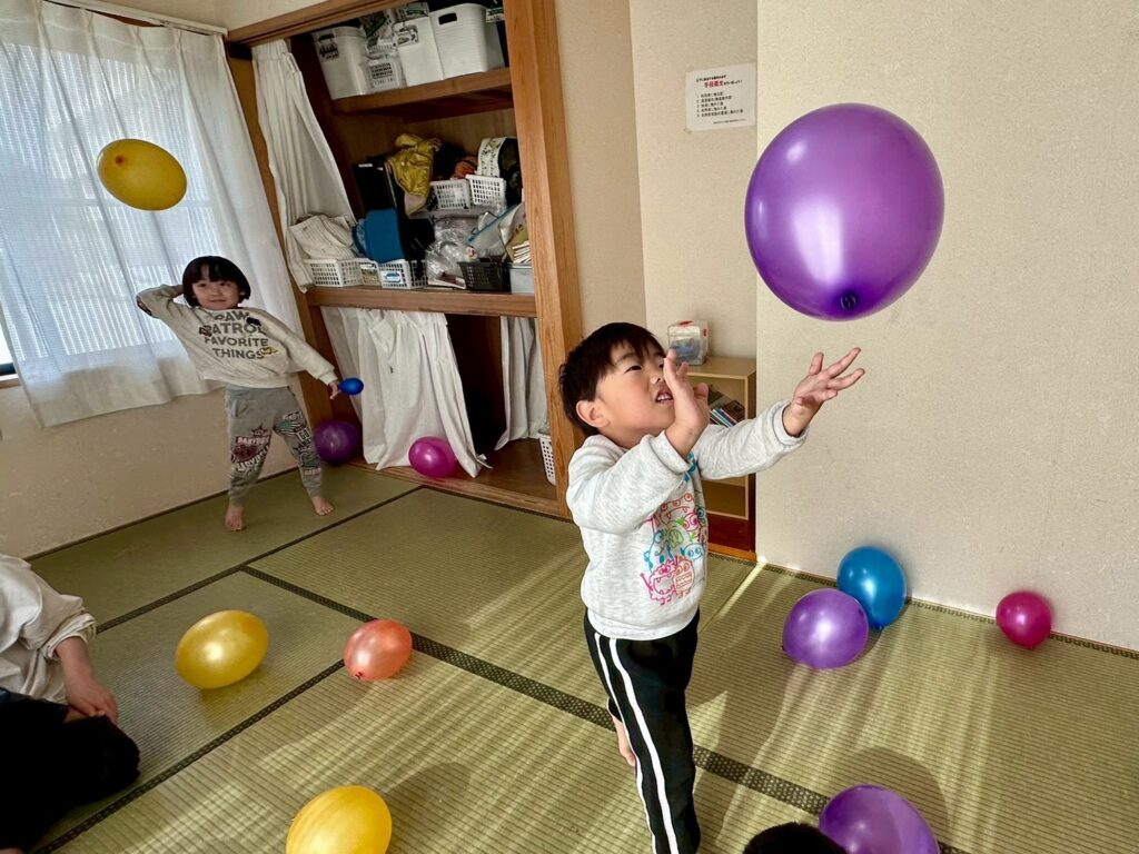 つばめ組さんは、リビングと和室を使ってたくさん体を動かしたよ。飛び石に両足ジャンプにジグザグ歩き!!初めて挑戦した子たちもいたけど、お手本を見て頑張れました✨ごほうびは風船遊び!!とっても楽しかったね♪