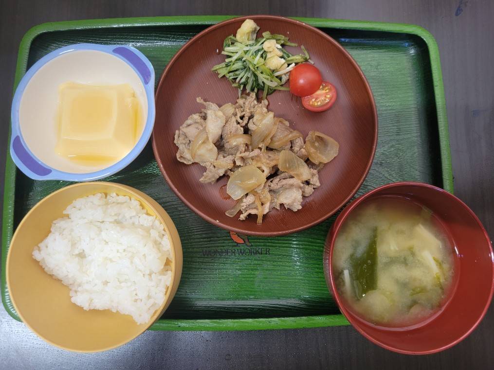 ご飯・あおさの味噌汁・焼き肉・水菜のお浸し・ミニトマト・たまご豆腐