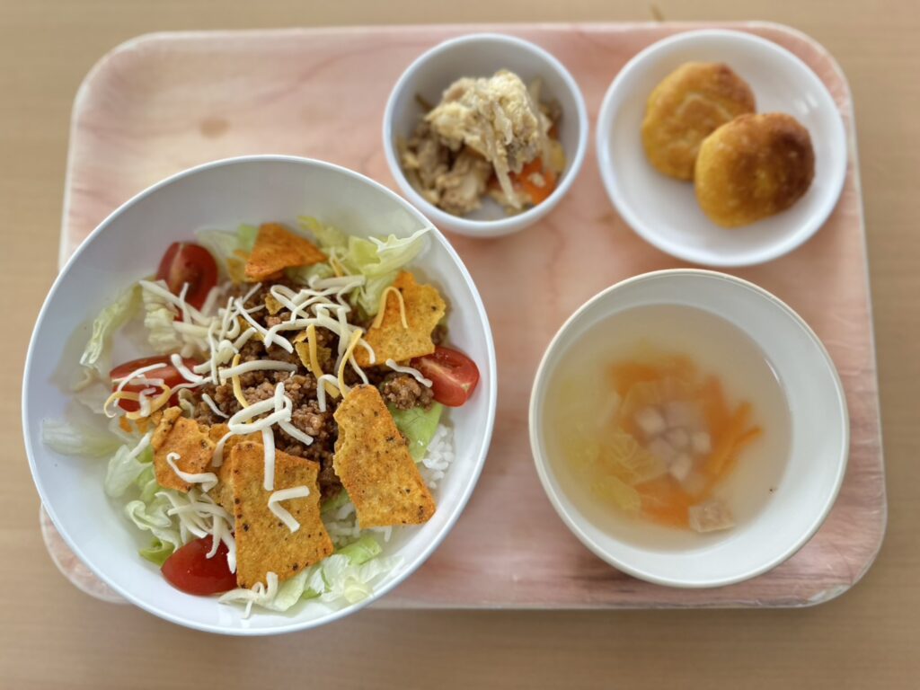 タコライス、コンソメスープ、厚揚げチャンプルー、チキンナゲット、源氏パイ/オレオチョコクリームサンド