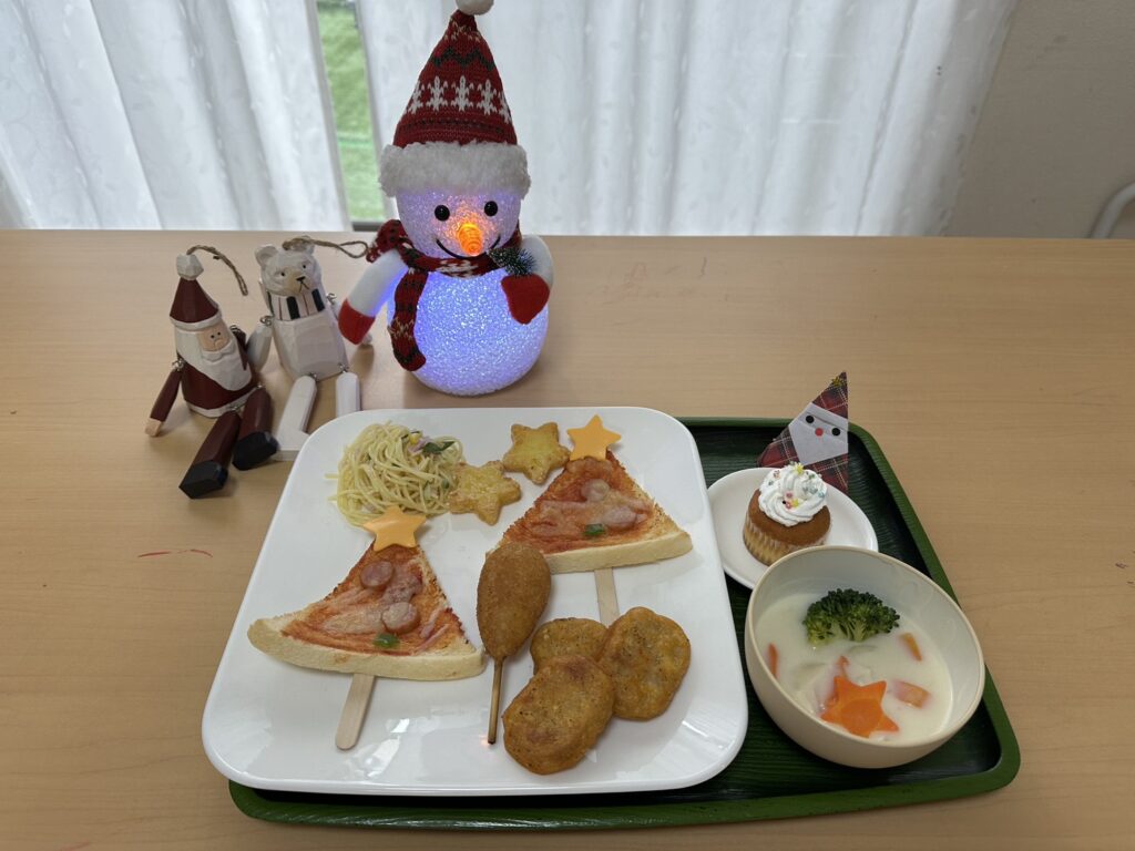 【クリスマスランチ】クリスマスツリーピザトースト、シチュー、スパサラ、チキンナゲット、アメリカドッグ、スターポテト、クリスマスカップケーキ/おにぎりせんべい