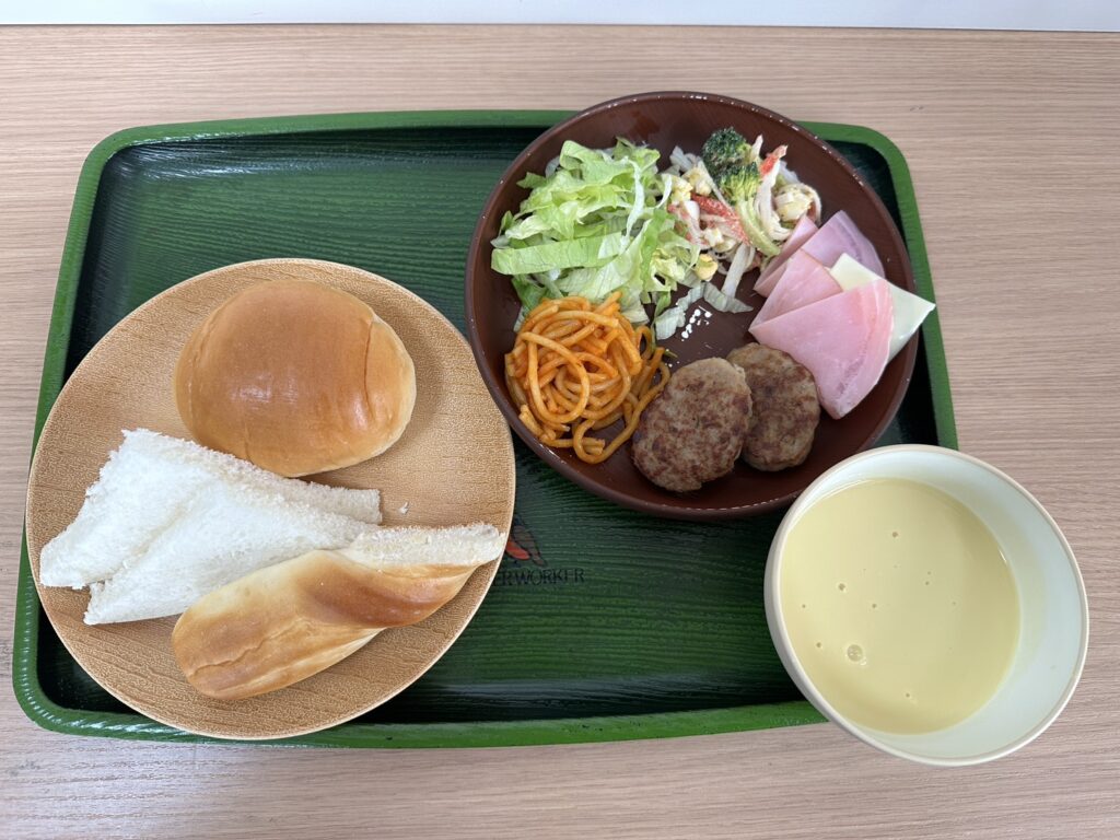 選べるパン(食パン、バターロール、バタースティック)、コーンスープ、ハンバーグ、ナポリタン、ブロッコリーとたまごのサラダ、ハム&チーズ/ヨーグルト(いちごジャムorブルーベリージャム)・セレクトお菓子