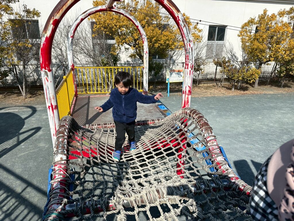 初めてのかもえ児童遊園。船の形の遊具に目をキラキラさせ、夢中で遊んだよ!(^^♪
