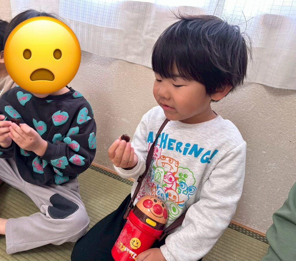 防災食を食べてみよう!ということで”えいようかん”をみんなで試食したよ☺甘くておいしかったね!災害はいつ・どこで起きるか分からないから、お家の人と防災食や防災グッズを一緒に準備してね!