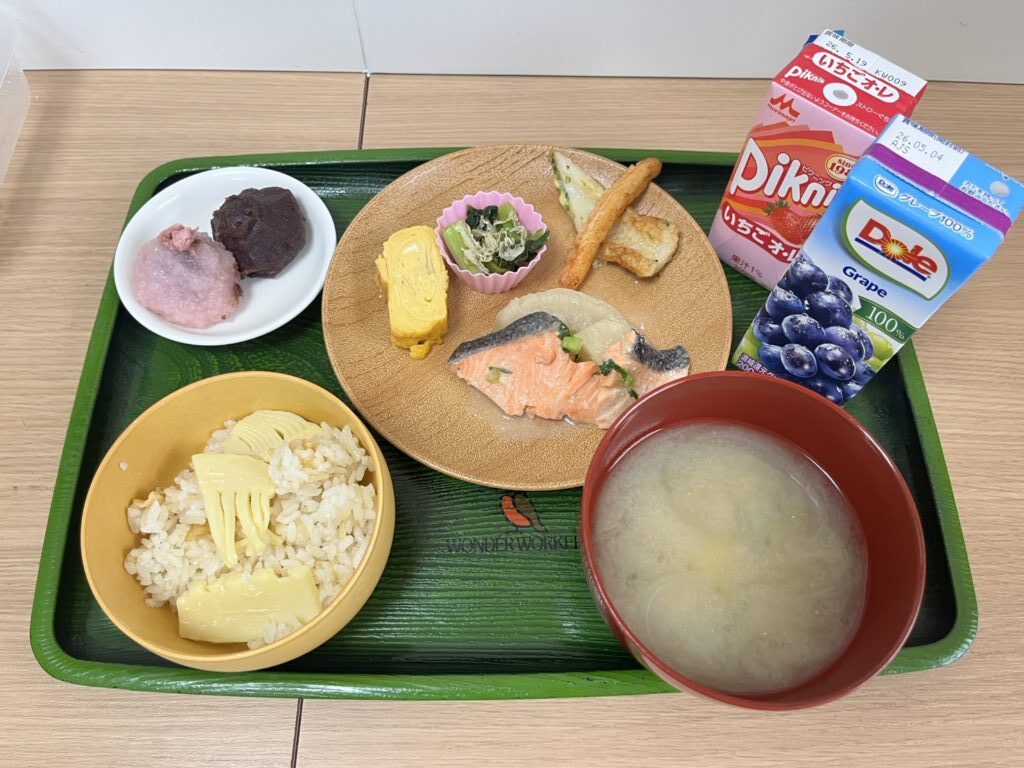たけのこの炊き込みご飯・さつまいもと新玉ねぎのみそ汁・鮭大根・玉子焼き・ちくわの天ぷら・カニカマの天ぷら・小松菜のとろろ昆布和え