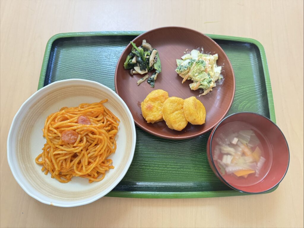 ナポリタン・コンソメスープ・チキンナゲット・しめじとほうれん草のバター醤油ソテー・ブロッコリーとたまごのサラダ