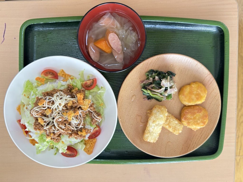 タコライス・ポトフ風スープ・チキンナゲット・ハッシュドポテト・ほうれん草とベーコンのバターソテー コアラのマーチ/おっとっと